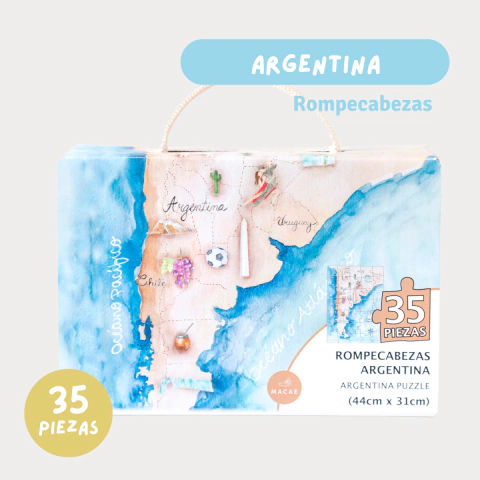 Rompecabezas de 35 piezas, medida total armado 44x35 cm. Argentina, hermoso país de sudamérica, su terreno tan diverso que incluye las montañas de los Andes, lagos glaciales, praderas en las Pampas… con tradiciones llenas de vida, te invitamos recorrer un poco de su belleza. Ilustraciones por Cristina Lienau Ig @crissyli
